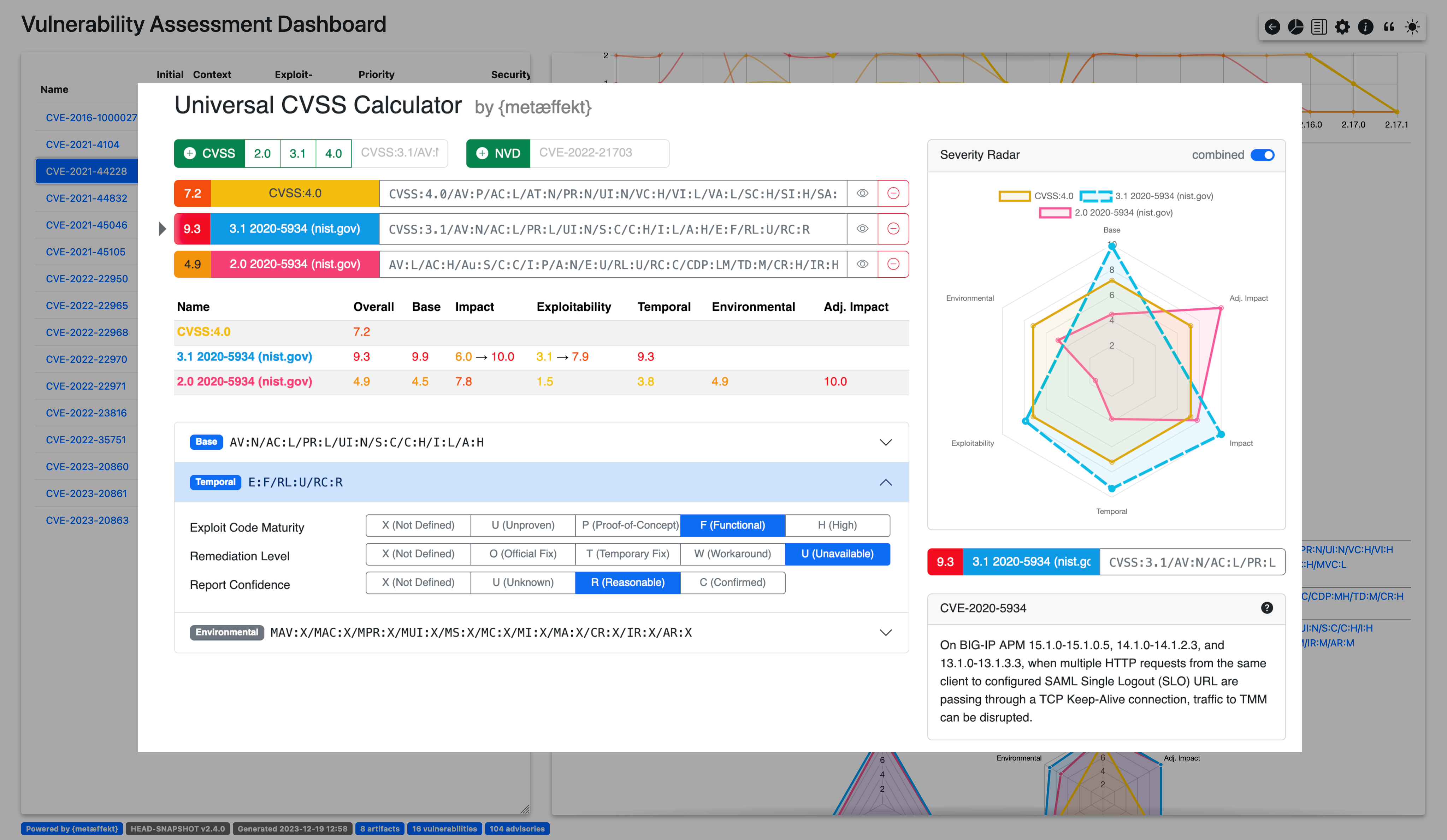 Der {metæffekt} Universal CVSS Calculator [externer Link] ist als erster Rechner in der Lage, die Schweregrade mehrerer CVSS-Vektoren unterschiedlicher Versionen (inklusive der neuesten CVSS:4.0) zeitgleich zu berechnen und diese konsistent vergleichbar zu machen. Umgesetzt in TypeScript unter einer permissiven Open-Source-Lizenz mit einer direkten Integration in unser Vulnerability Assessment Dashboard gehen wir damit einen weiteren Schritt zu einem vollständigen und öffentlichen Werkzeug-Set.