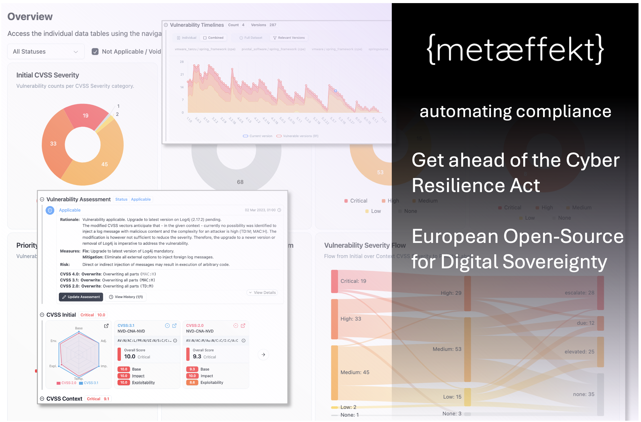 In den vergangenen 4 Jahren wurde das Vulnerability Assessment Dashboard der {metæffekt} stetig weiterentwickelt. Inzwischen sprechen wir von der 4. Generation des Dashboards. Es stellt die Softwarekomponenten ausgewählter Assets mit ihren Schwachstellen zusammen und ermöglicht eine Kontextualisierung im eigenen Produkt. Schwachstellen können gebündelt oder individuell bewertet werden. Unterstützend werden verschiedene Datenquellen rund um die Schwachstellen zusammengetragen und in spezifischen Sichten dargestellt. Zuletzt wurden mit CAPECs und CWE Details aus der Bedrohungsanalyse aufgenommen.